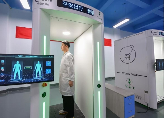 在安徽中科太赫兹科技有限公司技术研发室内,科技人员正在调试太赫兹人体安检设备。赵明 摄