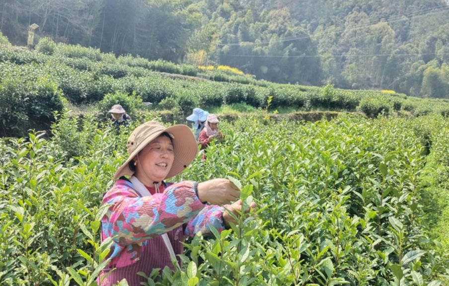 3月25日,是太湖县晋熙镇月鑫家庭农场春茶开采的日子。一大早,工人们身着背篓或布囊在茶园里忙着采摘绿中带黄的香芽。