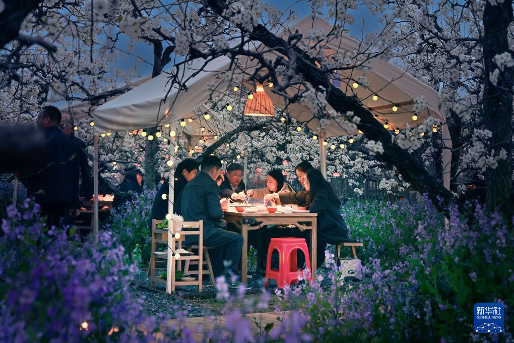 3月30日,游客在砀山县梨小萌欢乐梨园品尝梨园火锅。新华社发(崔猛 摄)