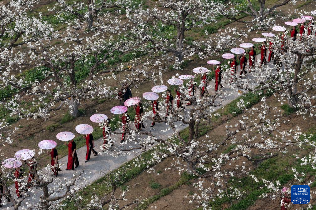 眼下,安徽省宿州市砀山县50万亩梨树迎来盛花期,千树万树梨花如云似雪,漫野飘香。丰富多彩的活动在梨园上演,吸引各地游客前来踏青赏花。