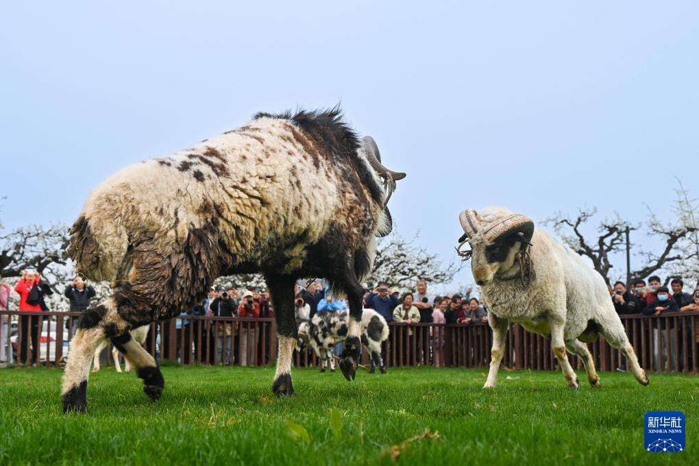 3月30日,游客在砀山县梨树王风景区观看斗羊比赛。新华社发(崔猛 摄)