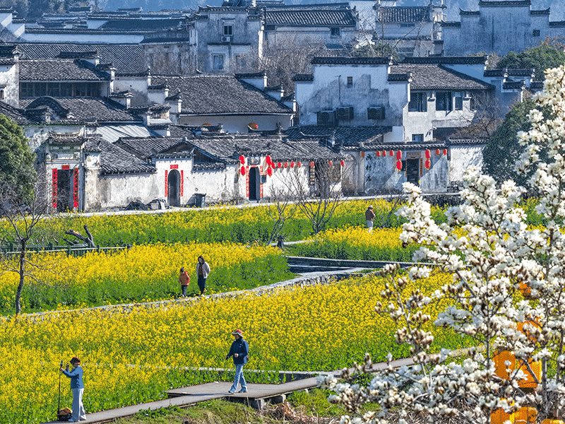 2026年3月13日,游客在安徽省黄山市黟县西递古村落欣赏春意盎然的油菜花美景。