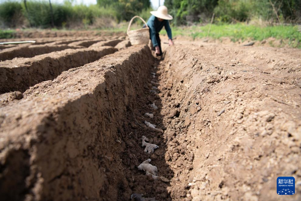 4月5日,在安徽省铜陵市郊区大通镇大院村,农民在种植白姜。新华社记者 张端 摄