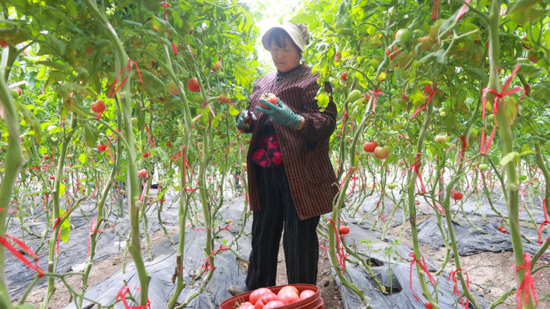 安徽省宿州市泗县长沟镇汴河村的万亩蔬菜产业园里,工人在采摘普罗旺斯西红柿。