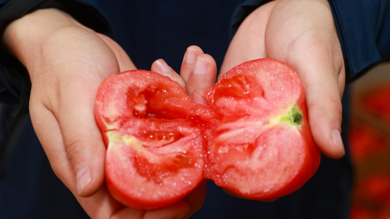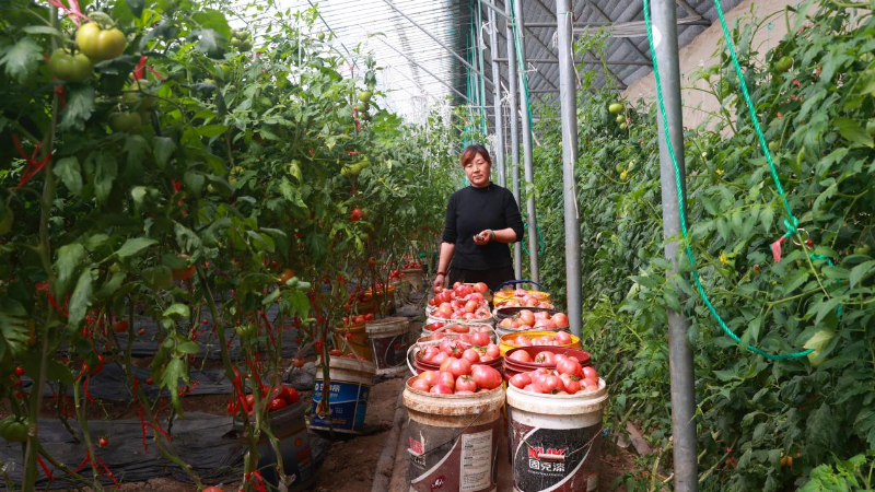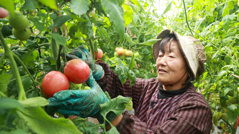 安徽省宿州市泗县长沟镇汴河村的万亩蔬菜产业园里,西红柿喜获丰收。