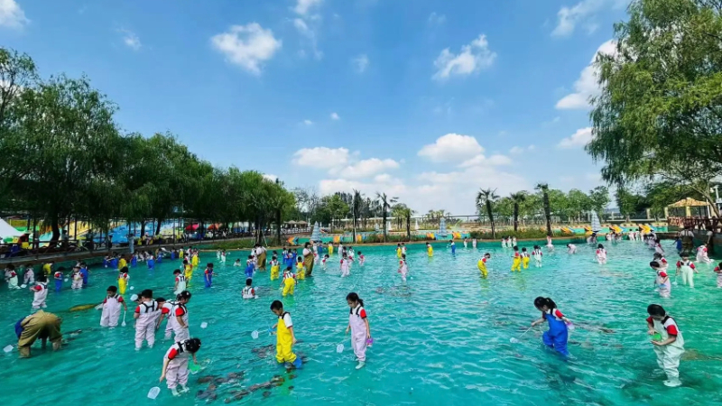 “抓到了!抓到了!”4月3日中午,玛雅森乐园捕鱼池边人声鼎沸。哨声一响,孩子们卷起裤腿冲进池水,水花四溅。按照规则,捕到的鱼免费带回家,既有竞技的刺激,又有收获的喜悦。假期里,乐园每天三场捕鱼赛,分大人组与儿童组,同时全天开放抓泥鳅、水上逮鸭子等活动,不限量投放渔获,让游客“满载而归”。这座临山傍水的乡村乐园,假期客流量几乎天天饱和。