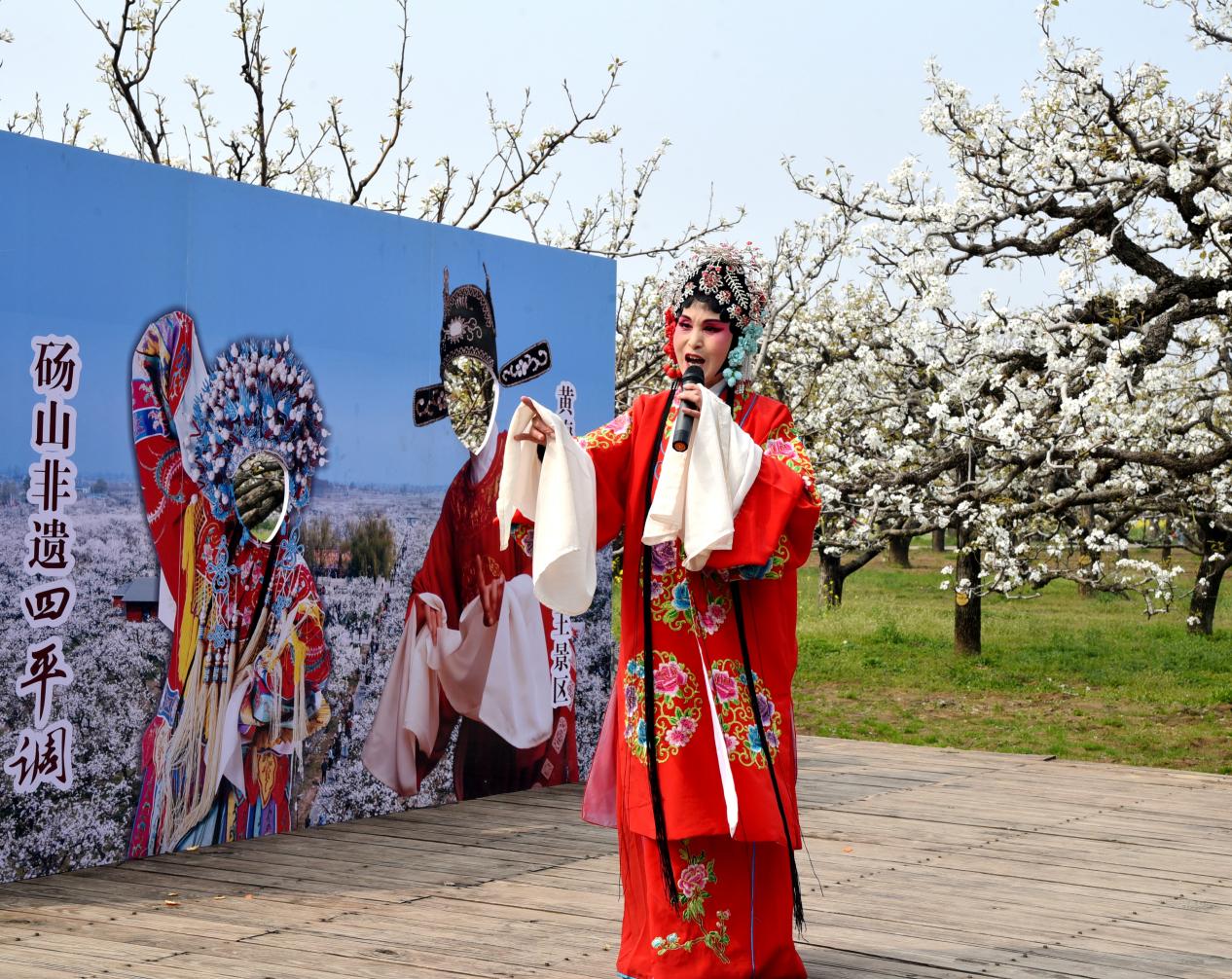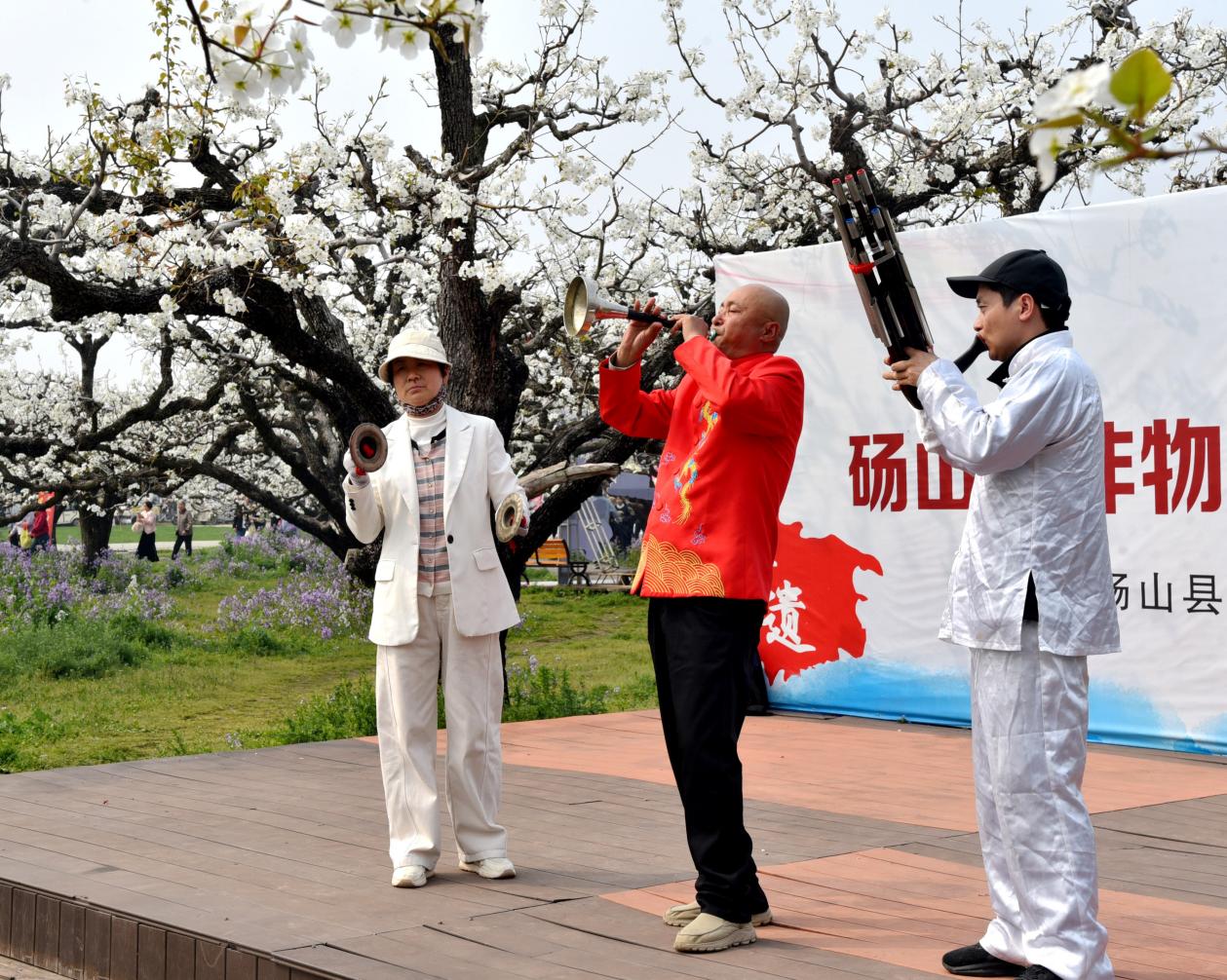 百年梨园繁花似雪,古树枝头春意盎然。活动现场,非遗展演与技艺展示相映成趣,热闹非凡。国家级非物质文化遗产砀山四平调、砀山唢呐轮番上演,婉转唱腔与嘹亮唢呐交织回荡在梨园之间,声声入耳、句句动情,让传统艺术在春日花海中焕发新生。