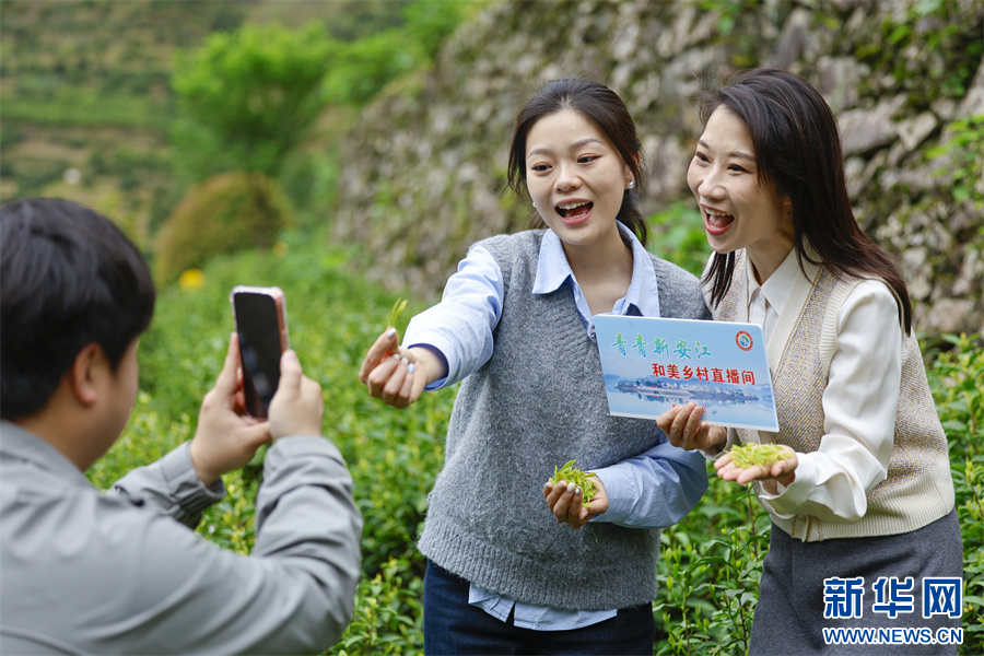 4月14日,安徽省黄山市歙县璜田乡蜈蚣岭村,主播在茶园里通过“和美乡村直播间”推介高山茶叶。
