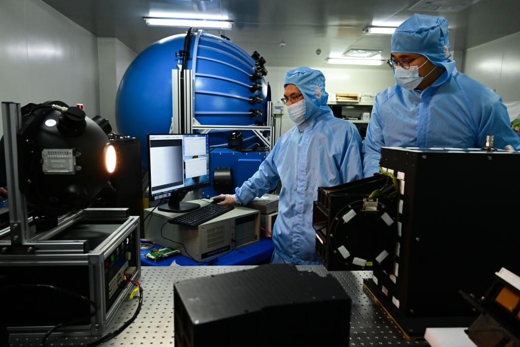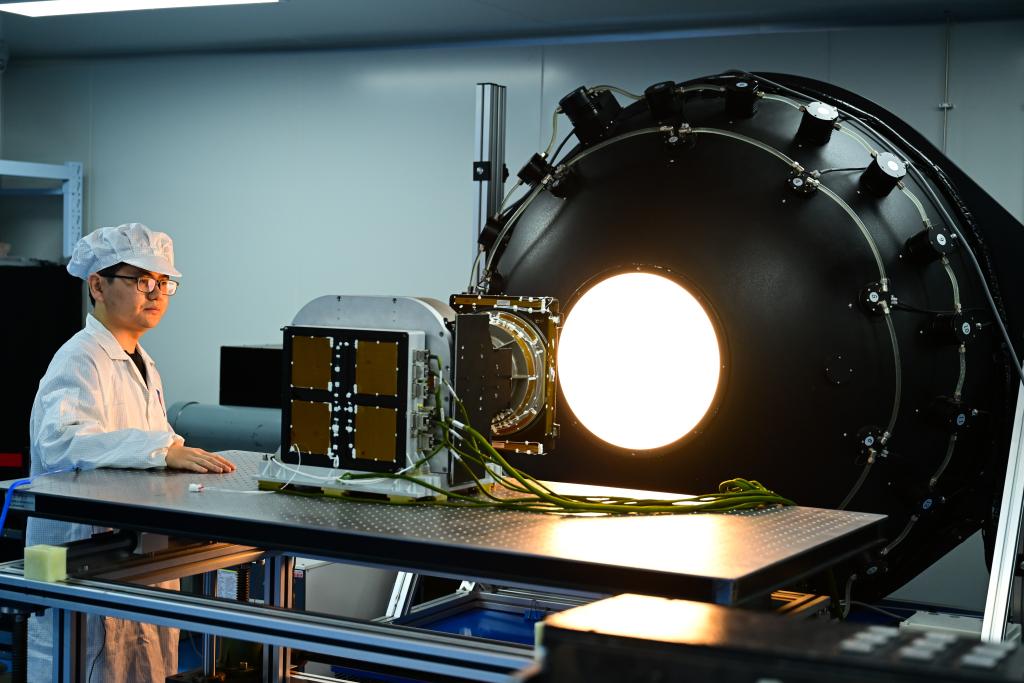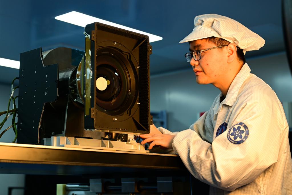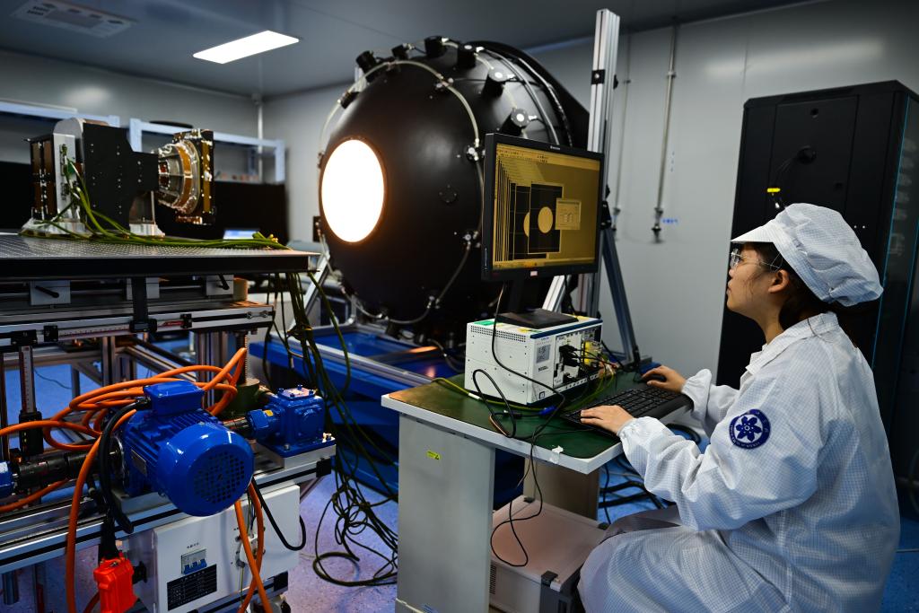 4月10日,在中国科学院合肥物质科学研究院安徽光学精密机械研究所光学遥感中心,科研人员在检查调试云和气溶胶成像仪(CAPC)。