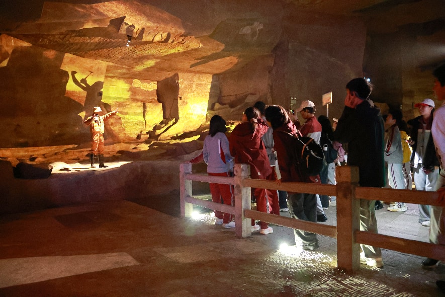 花山谜窟的研学课程兼具自然与人文底蕴,让学子在游玩中收获成长。学子们走进花山谜窟,沉浸式观赏千年石窟奇观,聆听成因猜想,触摸历史痕迹,感受古人技艺与徽州人文魅力。同时,景区航天航空军事科普展同步升温,学子们近距离观摩“大国重器”、体验趣味互动,在寓教于乐中厚植家国情怀,实现人文与科普的深度融合。