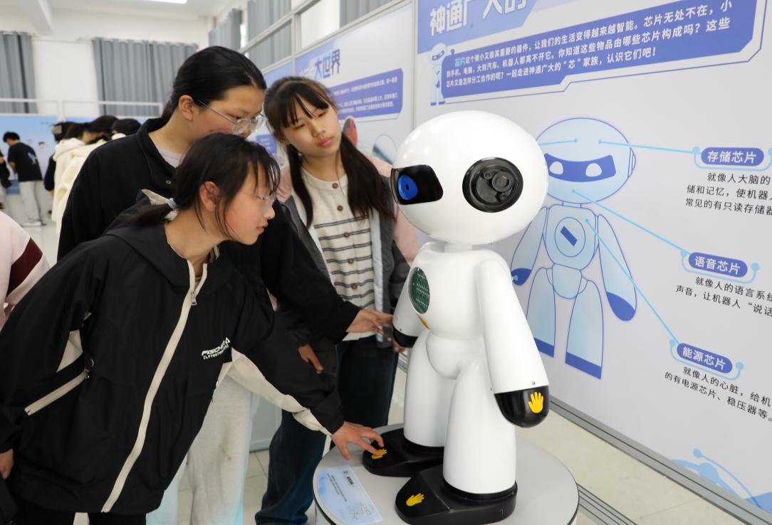 活动现场暖意融融、氛围热烈,科普志愿者化身专业“科学导师”,围绕“波的旅途”“AI超越人类”“点石成芯·芯创世界”三大展区,用通俗易懂的语言为同学们逐一拆解展品背后的科学原理。从声波可视化呈现的绚丽图案,到AI交互展品展现的智能科技;从芯片知识的通俗解读,到各类物理实验的直观演示,志愿者们巧用生动形象的表述、贴近生活的比喻,将抽象复杂的科学知识变得浅显易懂,同学们听得入神、看得认真。