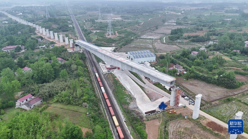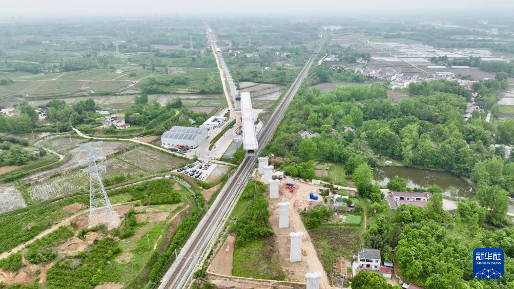 4月21日拍摄的合武高铁跨宁西铁路万吨连续梁转体施工现场(无人机照片)。新华社记者 周牧 摄