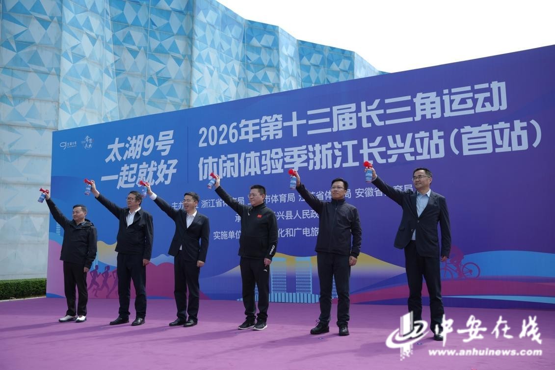 4月18日,2026年第十三届长三角运动休闲体验季(以下简称“体验季”)新闻发布会在浙江省湖州市长兴县举行,来自浙江、上海、江苏、安徽三省一市的体育部门领导、体育产业投资机构和旅行社负责人、媒体记者、运动休闲爱好者等200余人齐聚太湖之畔,共同见证体验季首站在浙江长兴启动。发布会上,三省一市联合发布今年体验季各站安排,邀请全国的运动休闲爱好者“跟着体验季 酷玩长三角”。