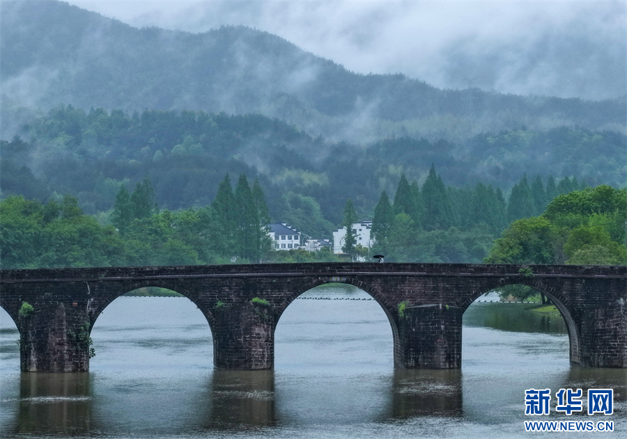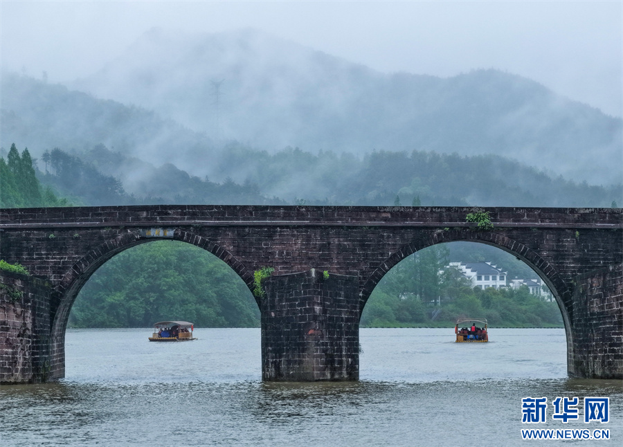 当日,春雨绵绵的安徽省黄山市休宁县齐云山景区风光旖旎,青山如黛,烟云缥缈,徽派民居若隐若现。游客泛舟横江,宛若穿行在水墨画卷中,令人心旷神怡。新华网发(施亚磊 摄)