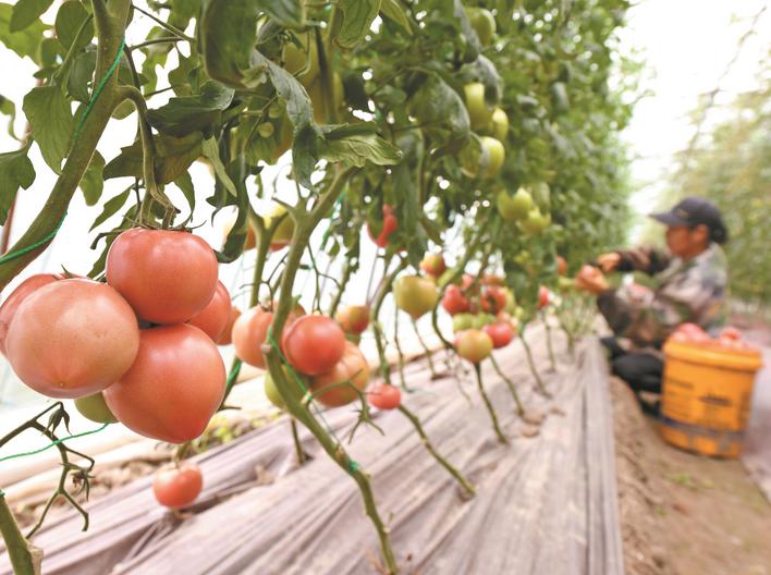 4月20日一大早,在中垾镇建华行政村何许村的连片大棚里看到,翠绿藤蔓顺着支架攀援生长,枝叶间挂满色泽鲜亮的番茄,红的似火、粉的似霞,饱满圆润、形态喜人。