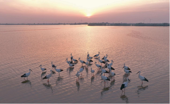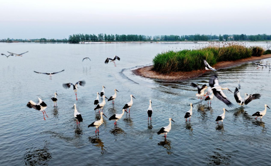近日,在颍上县八里河省级自然保护区,众多东方白鹳齐聚于此,或悠然信步浅滩,或舒展白羽翩飞,勾勒出一幅灵动和谐的生态画卷。