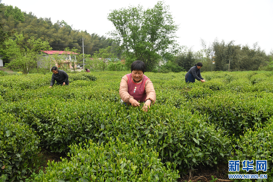 2026年4月14日,茶农在六安瓜片核心产区之一的安徽省六安市裕安区独山镇双峰村詹冲茶园采摘茶叶。新华网发(方好 摄)