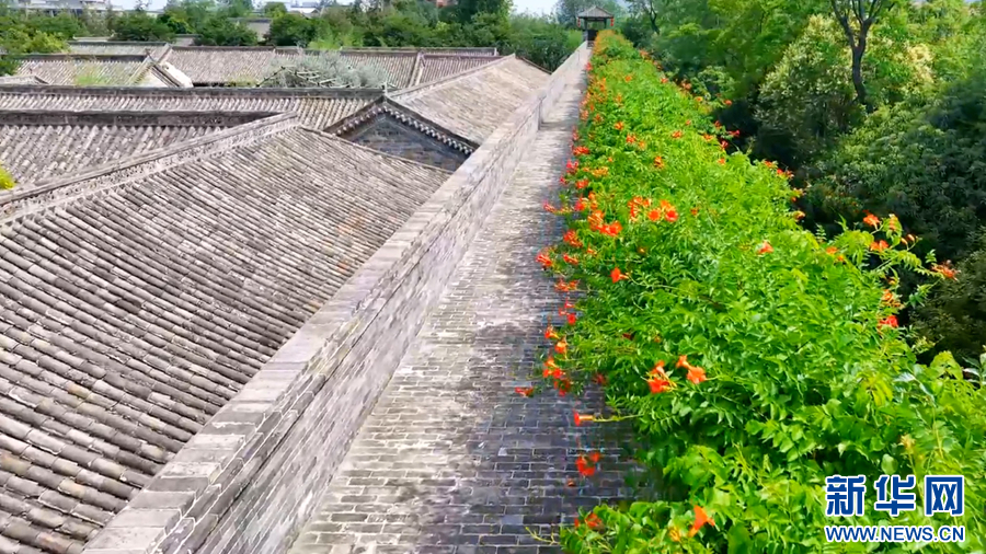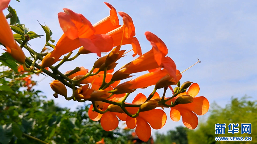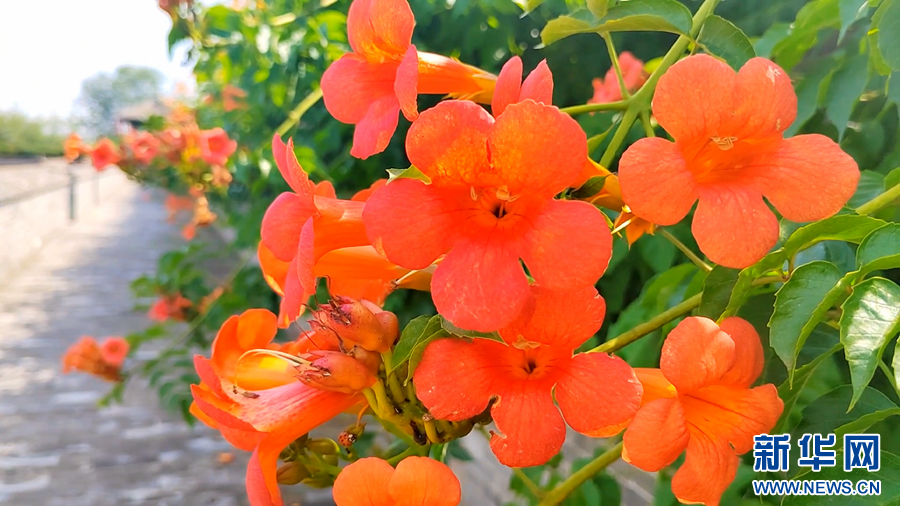初夏时节,安徽省阜阳市颍上尤家花园景区内凌霄花开正艳,一簇簇橙红色的花朵点缀在满墙的翠绿枝叶中,随风起舞,美不胜收。