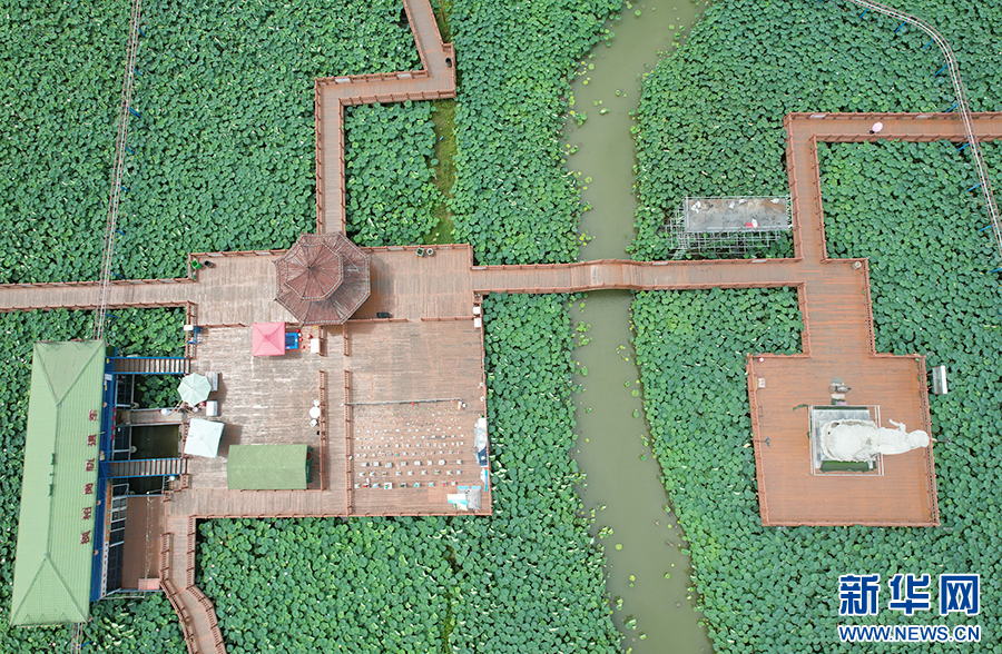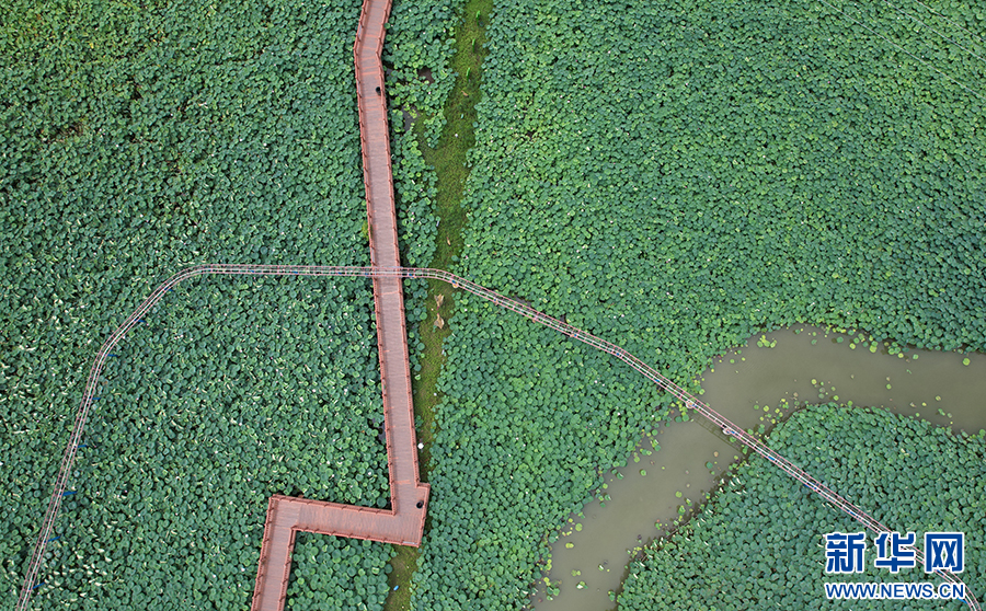 7月13日拍摄的安徽省阜南县地城镇枫柏岗4A级旅游景区荷塘栈道(无人机拍照片)。