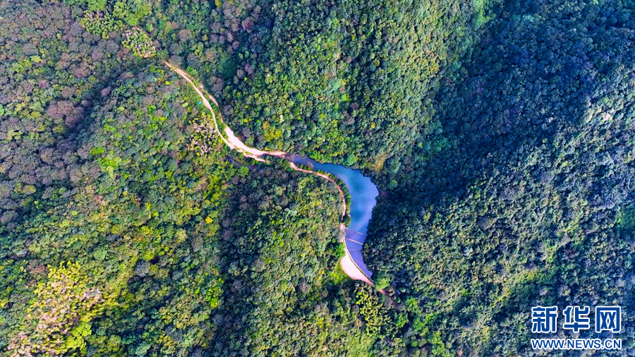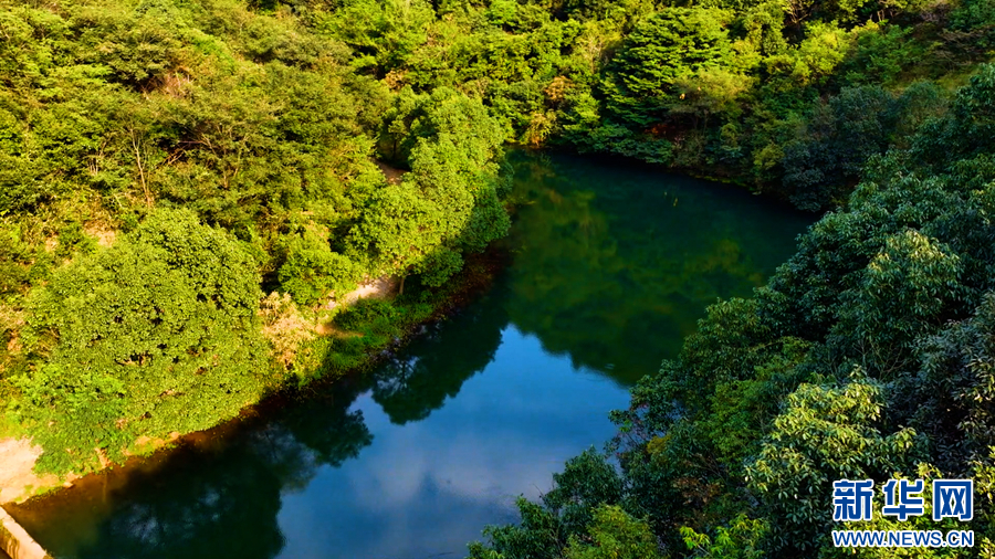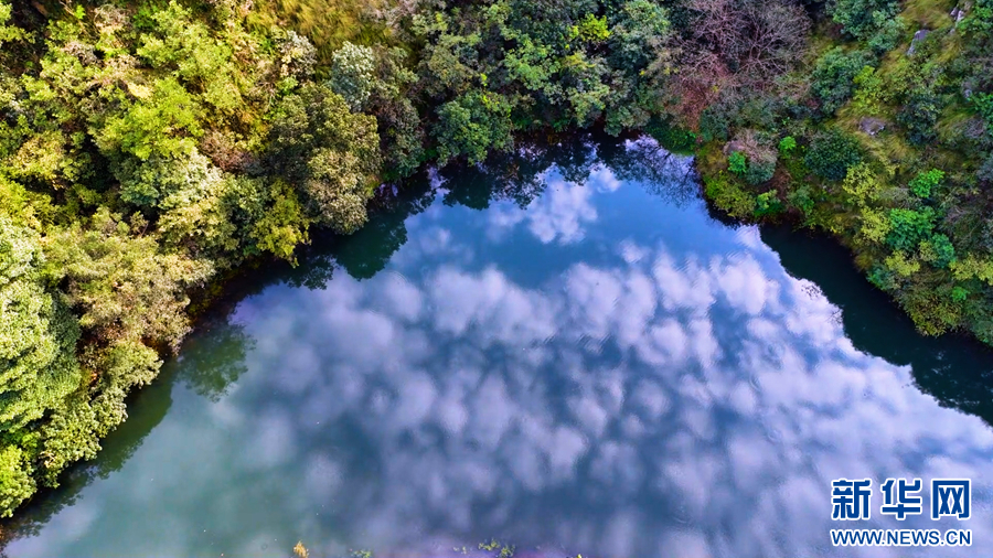 秋日里,在层峦叠嶂的山间,月牙形的山潭倒映着天光云影,树影染绿一潭秋水,美如一幅画卷。