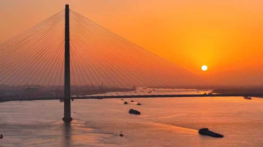 11月17日,临近芜湖长江二桥的三山港码头吊机林立,船只往来穿梭,在波光粼粼的江面上留下美丽的剪影。夕阳的余晖洒在江面上,与船只交相辉映,构成了一幅壮丽的画卷。
