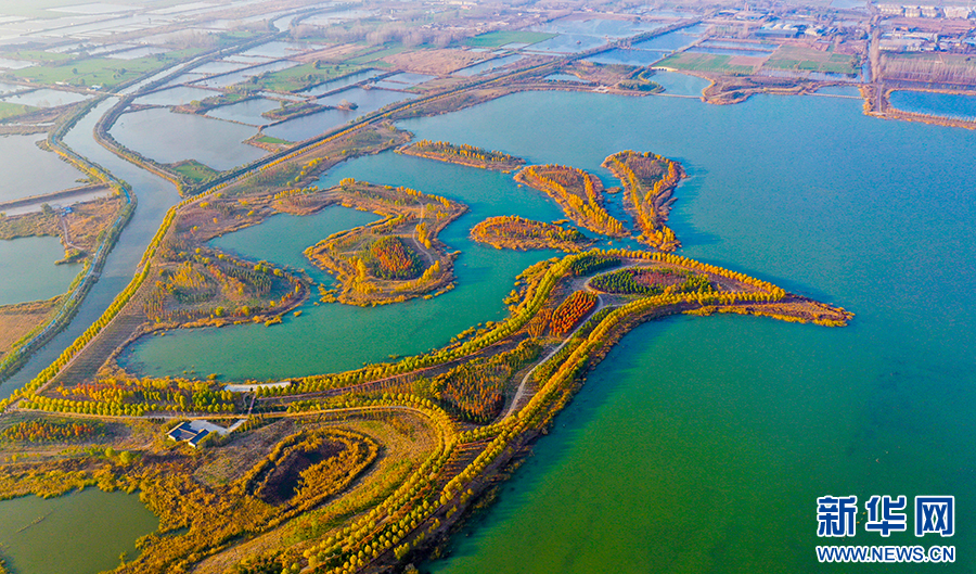 航拍风光旖旎的凤栖湖湿地公园。新华网发(黄洋洋 摄)