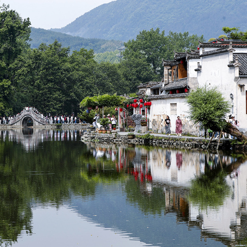近日,游客在世界文化遗产地安徽省黄山市黟县宏村游玩。