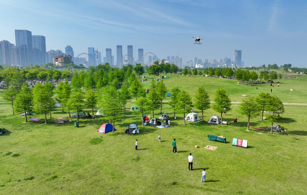 4月29日,在巢湖湖滨国家湿地公园岸上草原段,市民正在露营。新华社发(叶玉庭 摄)