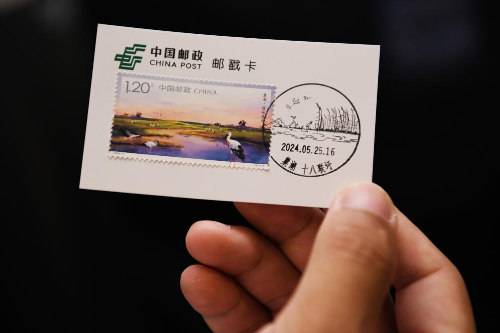 5月25日,在位于安徽省合肥市的合肥大剧院,市民展示购买的《巢湖》特种邮票。新华社记者 张端 摄