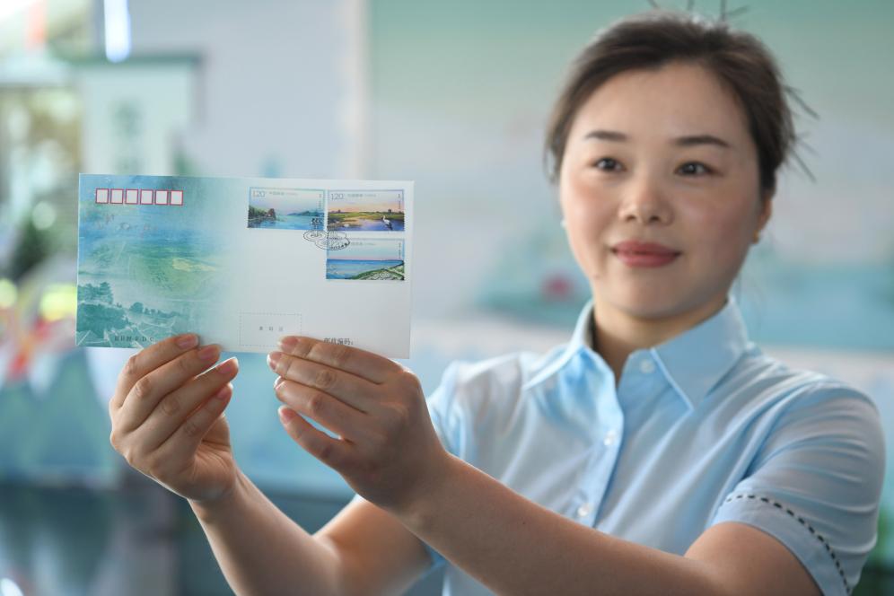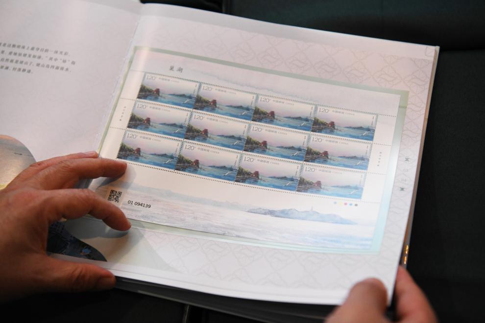 5月25日,在位于安徽省合肥市的合肥大剧院,工作人员展示《巢湖》特种邮票首日封。新华社记者 张端 摄