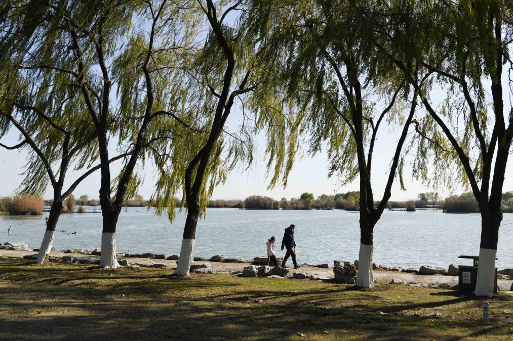 2022年12月18日,市民在巢湖湖滨国家湿地公园休闲。新华社记者 张端 摄