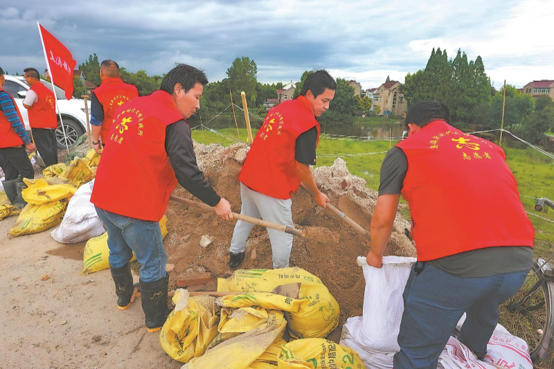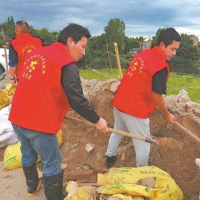 7月1日,当涂县乌溪镇由共产党员和群众组成的防汛抢险突击队奋战在抗洪抢险一线。 本报通讯员 汪宗本 尤贵芳 摄