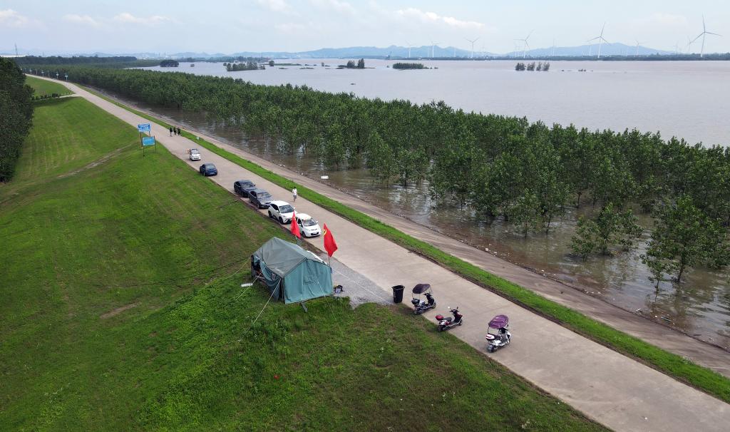 宿松是长江进入安徽的“第一站”,蜿蜒于长江北岸的同马大堤,是此轮防汛的关键。6月29日凌晨,当地长江汇口站水位超警戒水位且持续上涨,同马大堤启动Ⅲ级防汛应急响应,近千名干部群众被动员起来,日夜值守。谭康披上一件外套,凌晨5点就和爷爷爬上大堤。