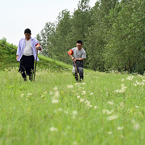 身材瘦小的谭康,穿着有些肥大的胶靴,与大伙儿并排走在帐篷下的护坡,用铁锹翻开没到小腿的杂草,查看有无管涌、渗漏。像这样的巡逻,每3个小时一次,虽然只有一公里,但看得细,来回一趟得四十分钟。