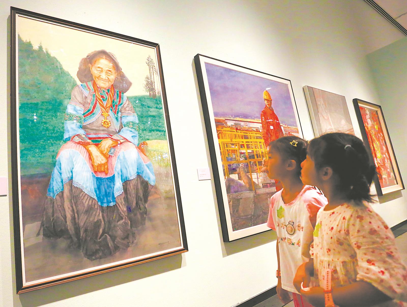 7月28日,安徽省美术馆内,儿童在家长陪伴下参观第十四届全国美术作品展览水彩、粉画作品展。本报通讯员 王玉实 杨先志 摄