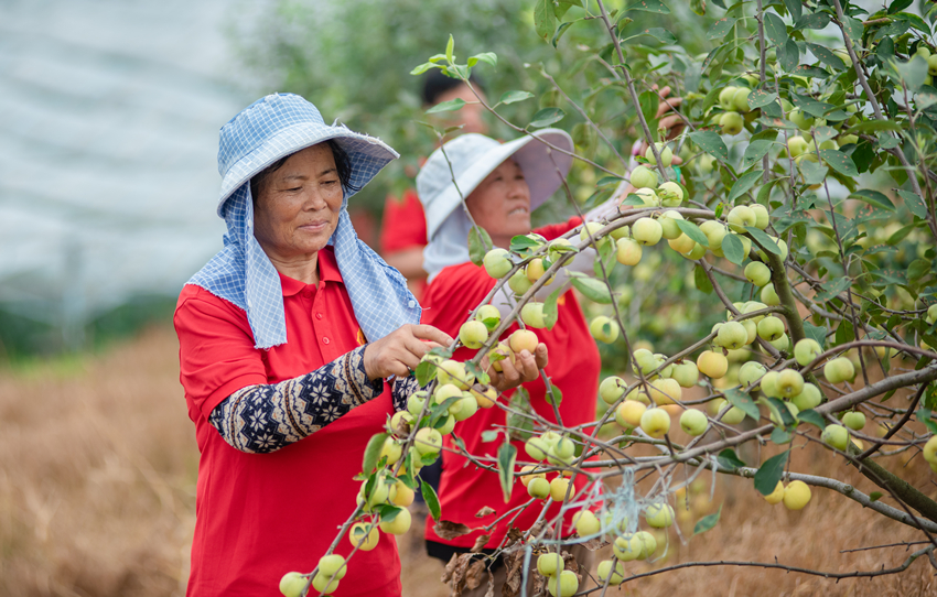 农户正在采摘“来安花红”。新华网发(吕华 摄)