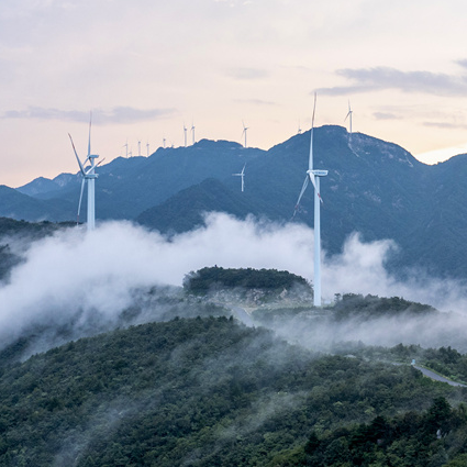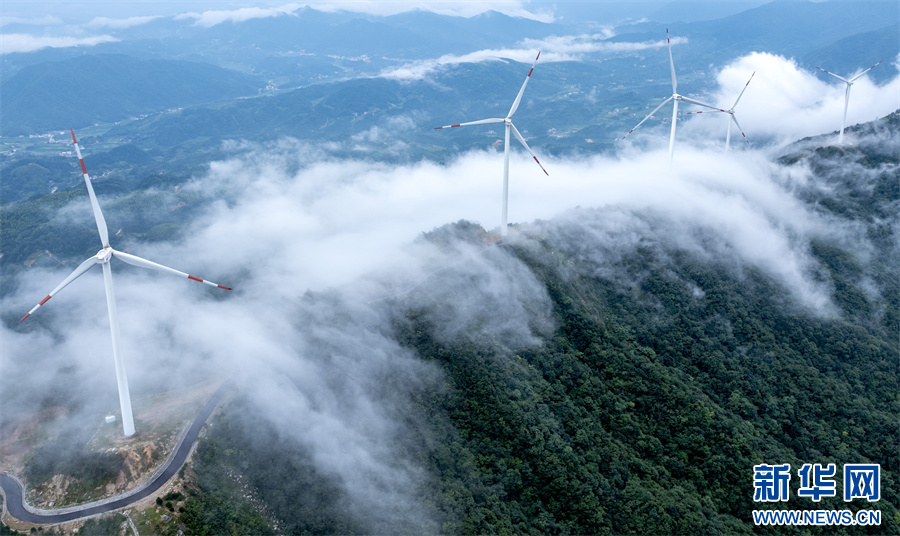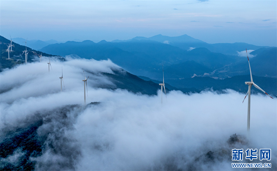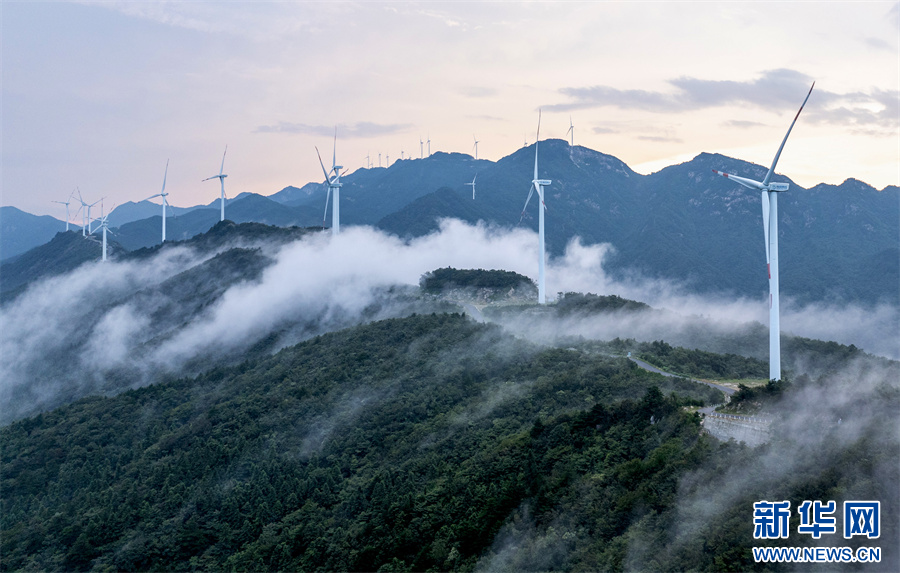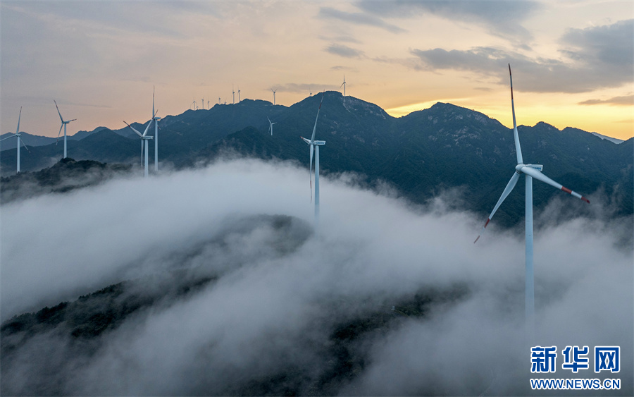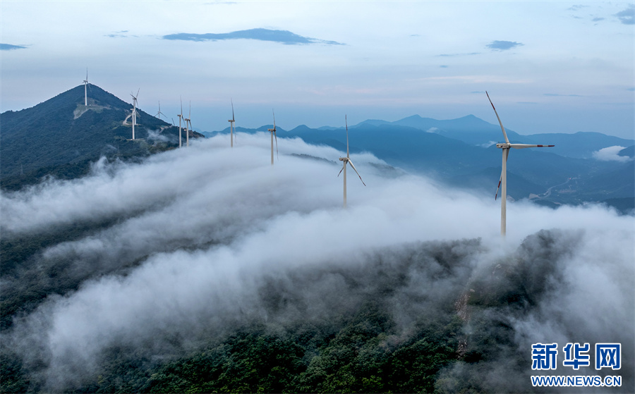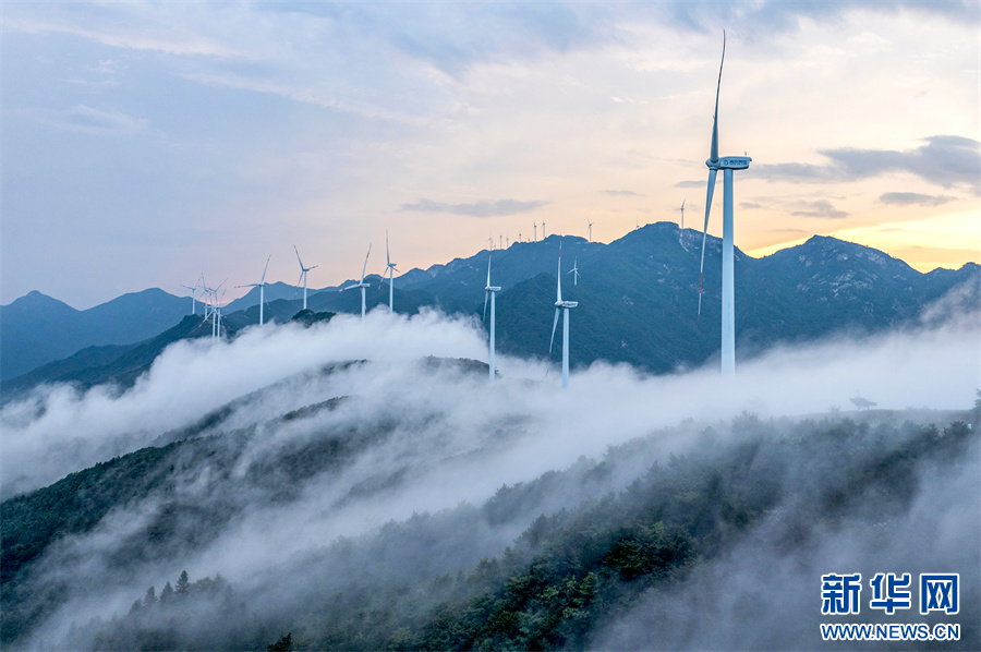 近日,在安徽省安庆市岳西县青天乡牛草山风力发电场,一座座“大风车”矗立在高山云雾之中,不断输送绿色能源。