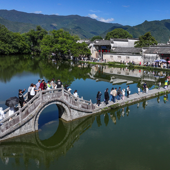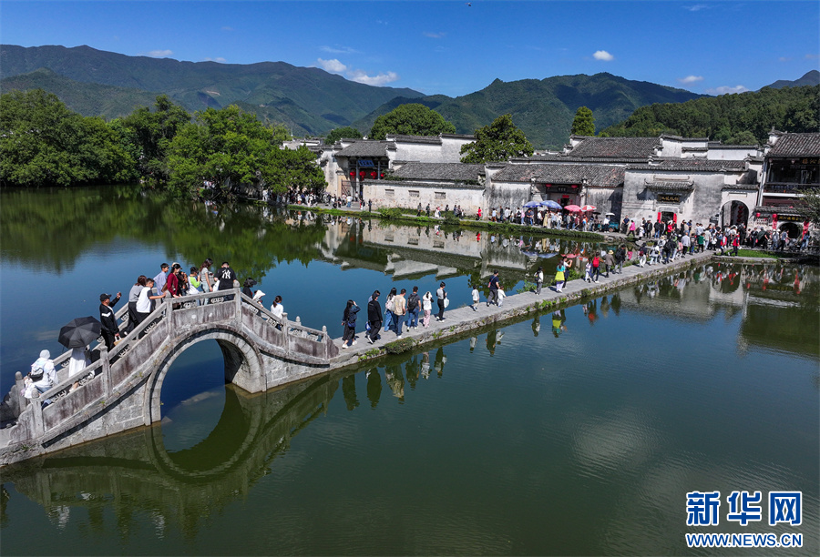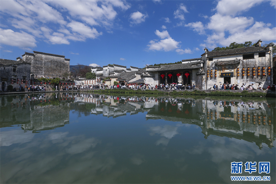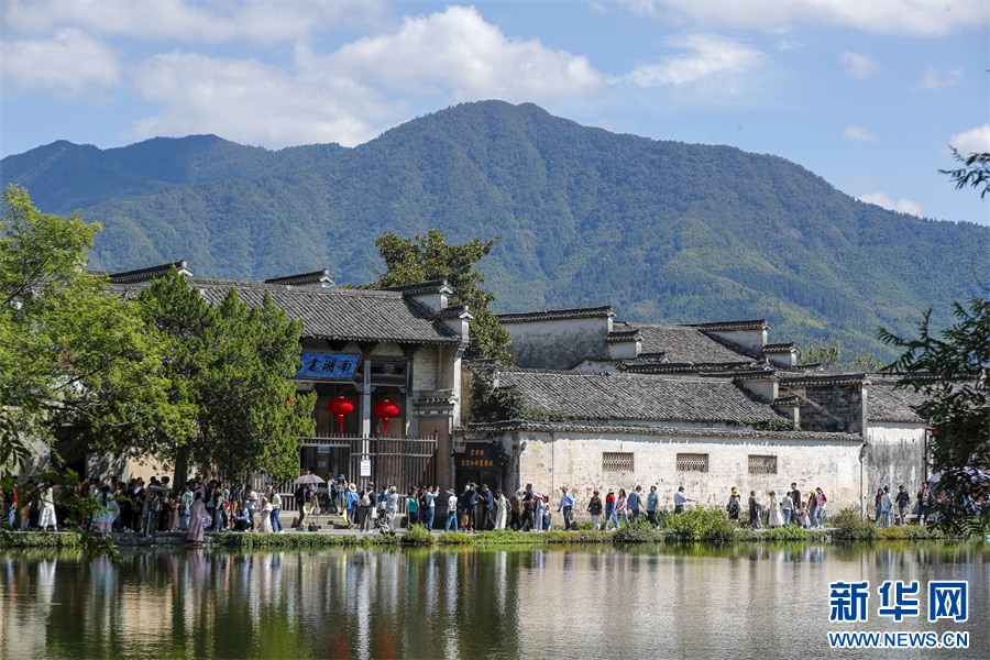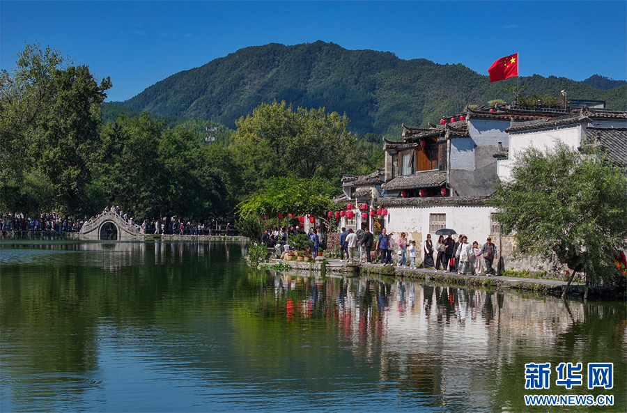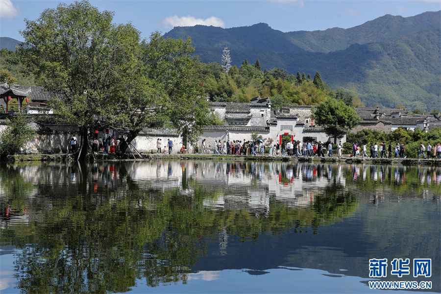 当日是国庆假期第3天,世界文化遗产地安徽省黄山市黟县宏村风光旖旎,众多游客纷至沓来,感受诗情画意的徽州乡村生态美景。 新华网发(施亚磊 摄)