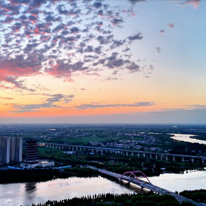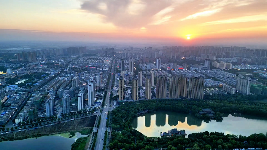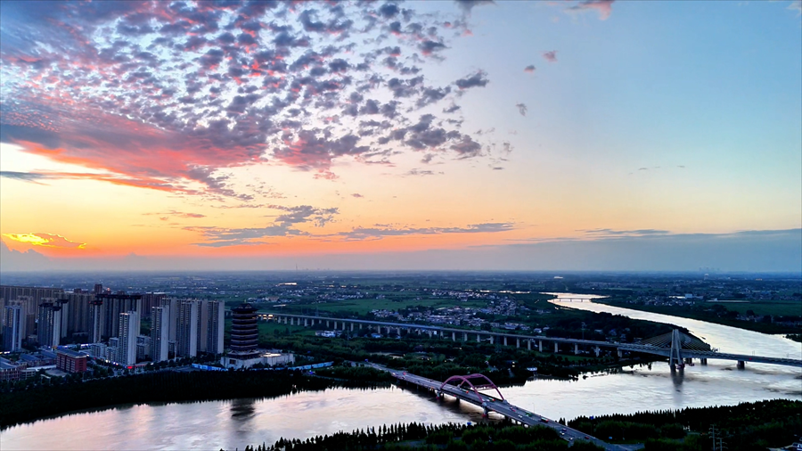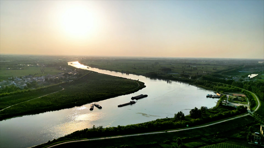 秋日傍晚,夕阳西下,安徽省颍上县颍河水面波光粼粼,落日余晖洒在其上,浮光跃金,美不胜收。