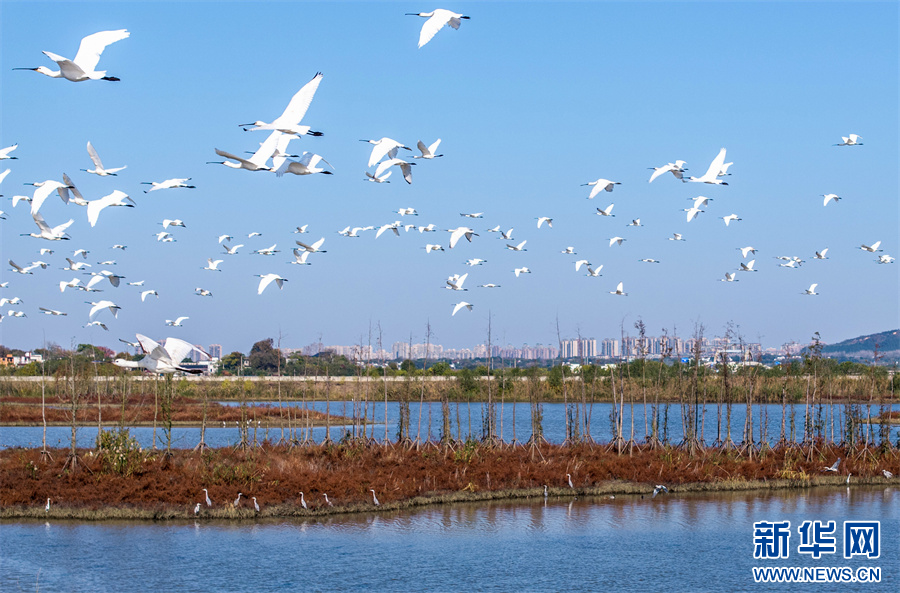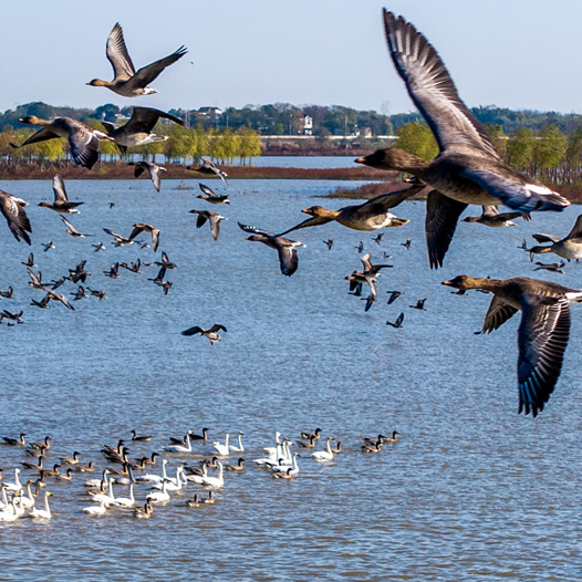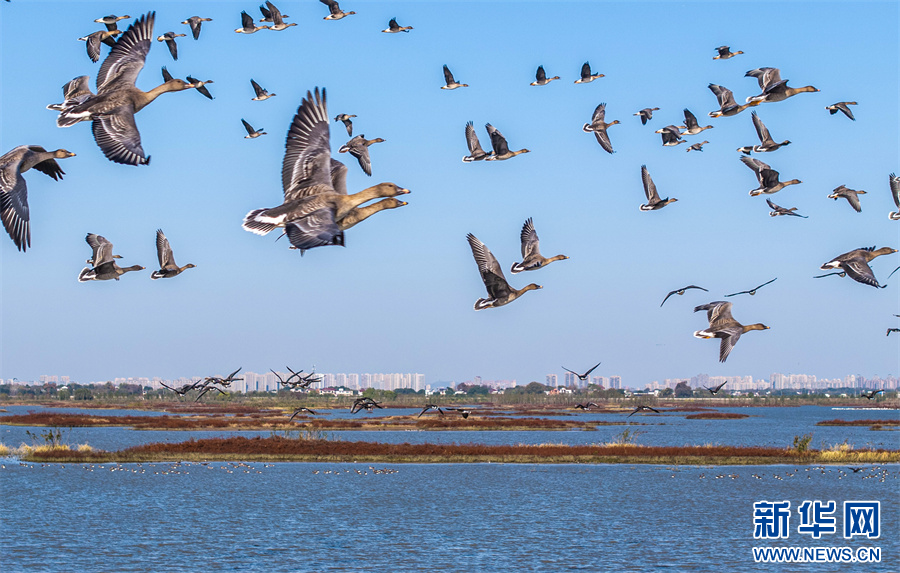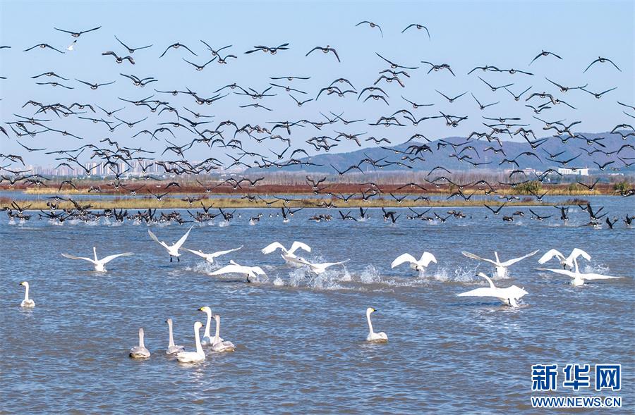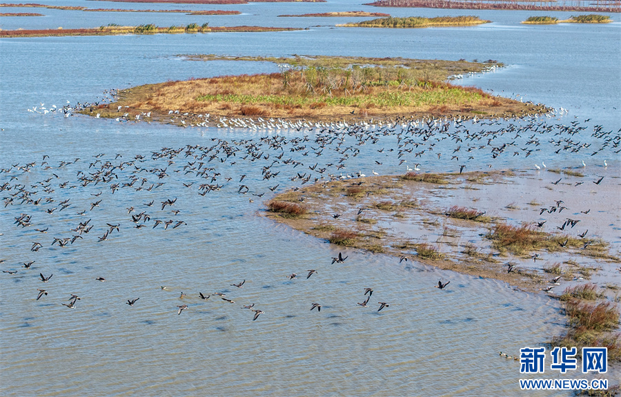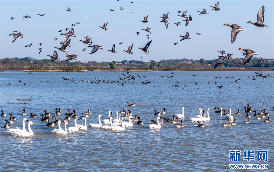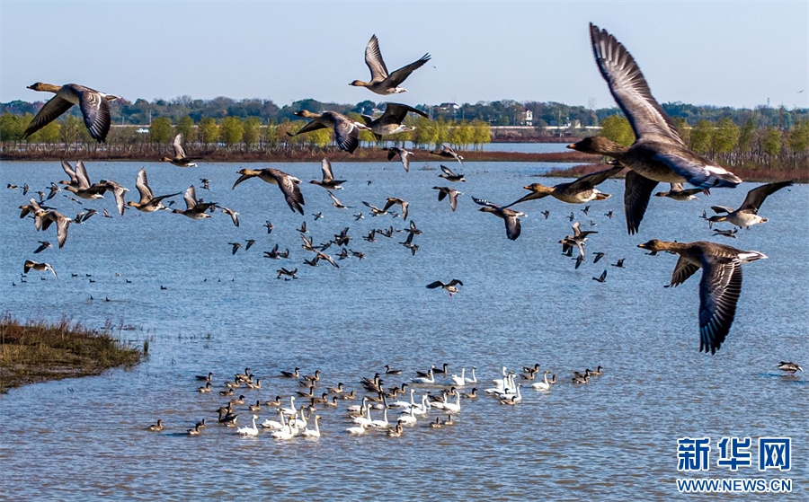 11月26日,安徽省合肥市庐江县黄陂湖湿地,成群的候鸟在嬉戏觅食、自由飞翔。