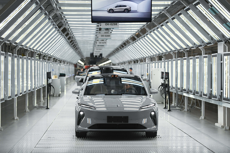图为安徽省合肥市新桥智能电动汽车产业园蔚来第二工厂内的新能源汽车生产线(5月9日摄)。新华社记者 张端 摄