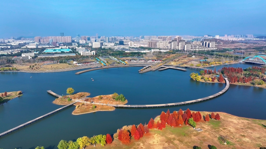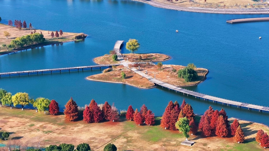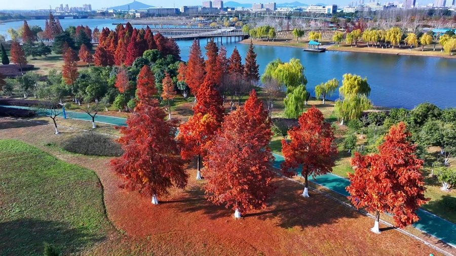 冬日时节,漫步在安徽省马鞍山市节庆广场,蜿蜒前伸的公园小径,树影婆娑的红杉林,与如镜的湖水相得益彰,引得游人沉醉在这滨河亲水空间之中。(濮勇)