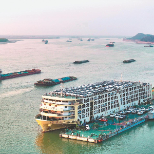 近日,安徽港口集团芜湖港朱家桥港区,一艘滚装货轮正在装载出口海外的汽车。通讯员 王玉实 梁浩 摄