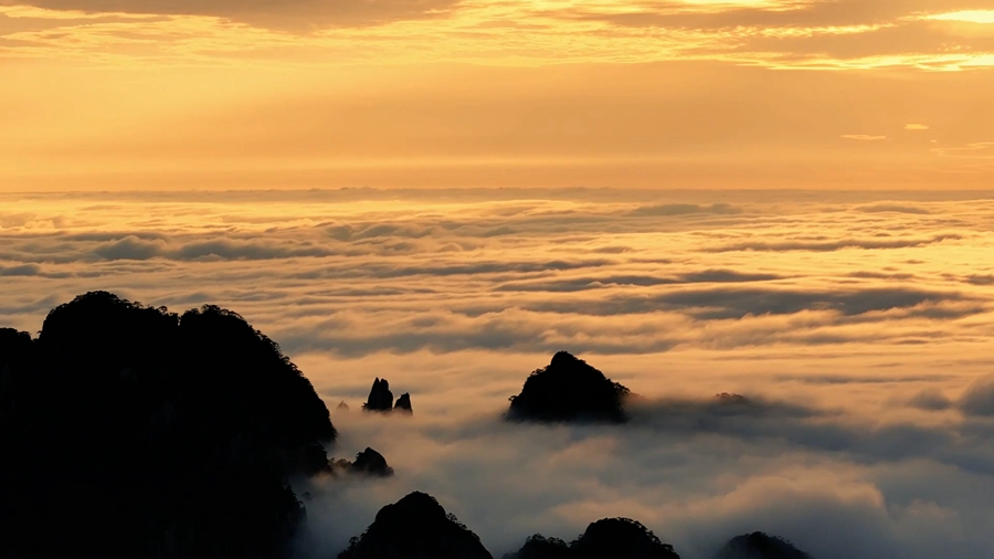 近日,在黄山风景区内,金色的夕阳穿透连绵起伏的云海,为远处的天际和近处的山峰镀上了一层金黄,构成了一副充满诗意的壮丽画卷。