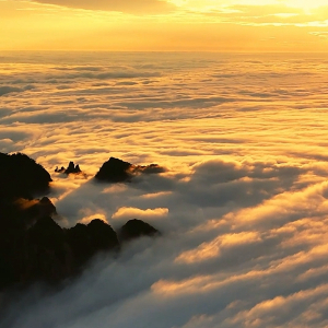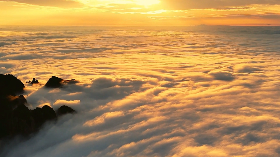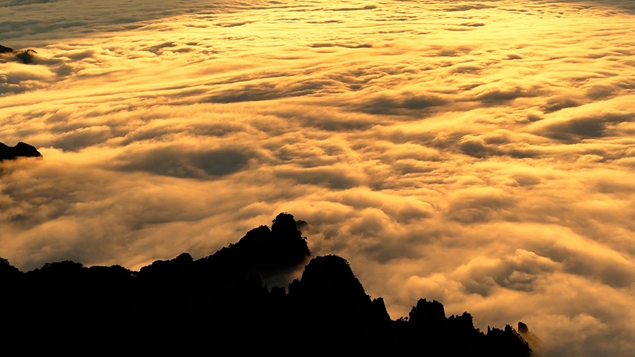 近日,在黄山风景区内,金色的夕阳穿透连绵起伏的云海,为远处的天际和近处的山峰镀上了一层金黄,构成了一副充满诗意的壮丽画卷。(李思洋)