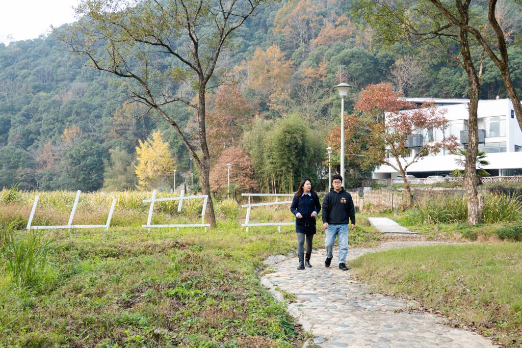 2024年12月3日,在安徽省黄山市黄山区汤家庄村,郭山秋韵(左)与爱人行走在民宿前的小路上。新华社发