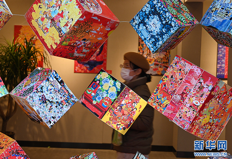 春节期间,市民在文化庙会上观赏年画。