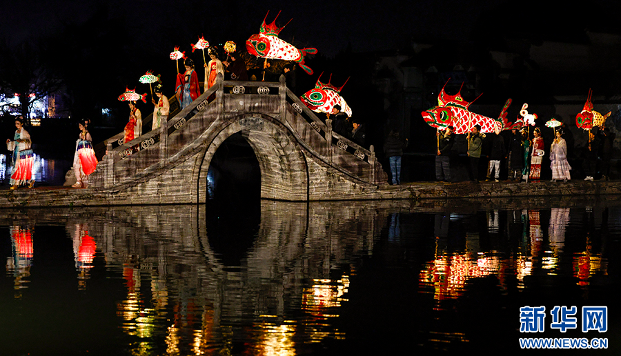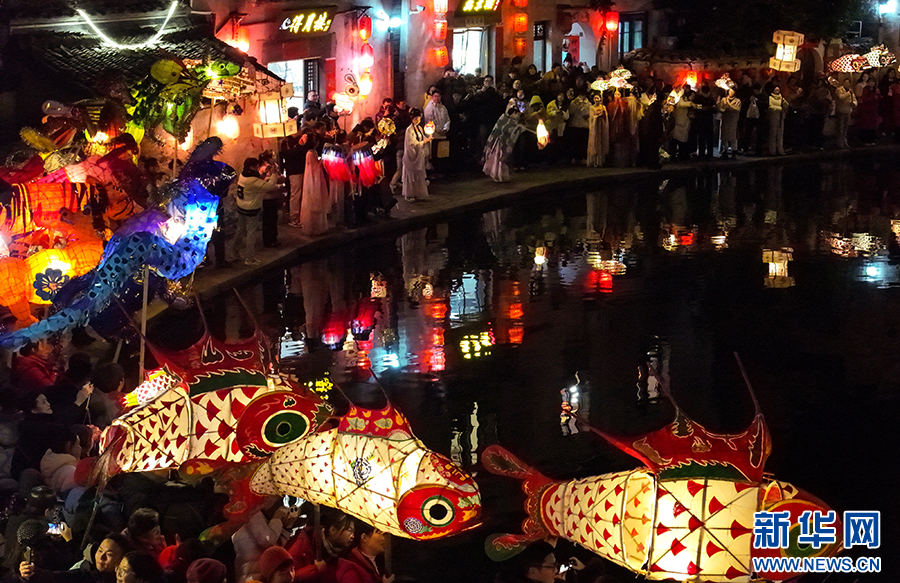 当日是农历正月十四,一场热闹非凡的“元宵闹灯会”在世界文化遗产地安徽省黄山市黟县宏村举行,缤纷多彩的花灯交织起舞,在古村中巡游祈福,吸引众多游客围观欣赏,喜迎元宵佳节。新华网发(施亚磊 摄)