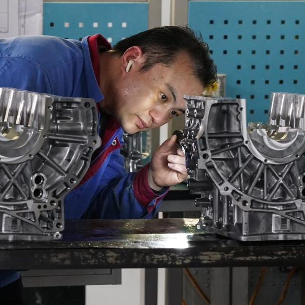 3月11日,工人在滁州悦达实业有限公司查看生产完成的混动发动机缸体。