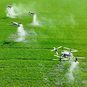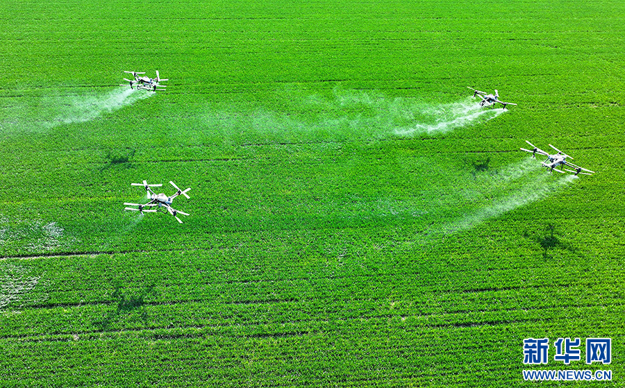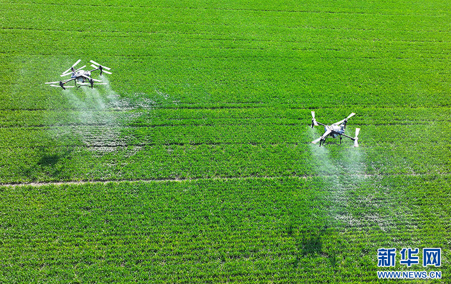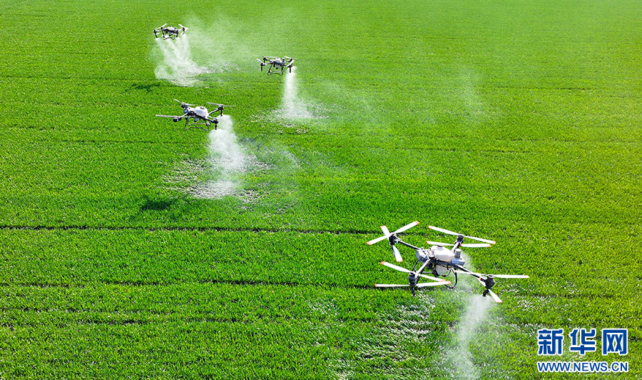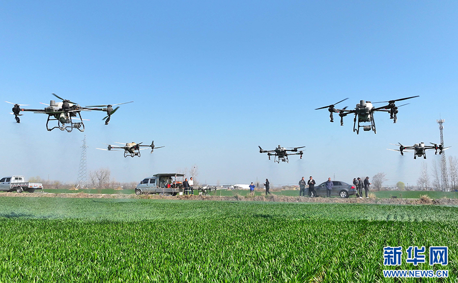 3月19日,在安徽省亳州市利辛县胡集镇张庄村,工作人员正操作无人机给小麦喷洒药物(无人机照片)。